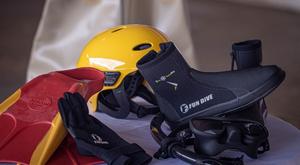 17 kits de salvamento aquático/mergulho (capacete, luvas, botas de neoprene, máscara, snorkel, nadadeira e colete salva-vidas);
