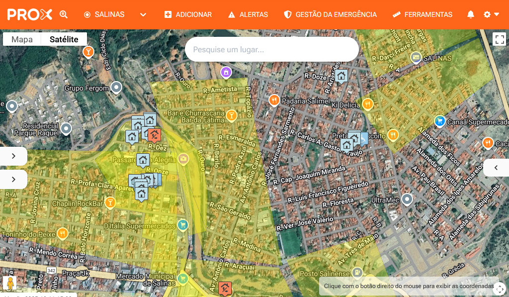 Para a execução do trabalho, foi utilizado o aplicativo PROX, uma ferramenta tecnológica desenvolvida para apoiar ações de mapeamento de áreas de risco, cadastro de populações vulneráveis e gestão de informações georreferenciadas. O PROX permite a coleta de dados em campo de forma padronizada, segura e integrada, facilitando o planejamento das ações preventivas, a emissão de alertas e a atuação coordenada entre os órgãos de Defesa Civil.