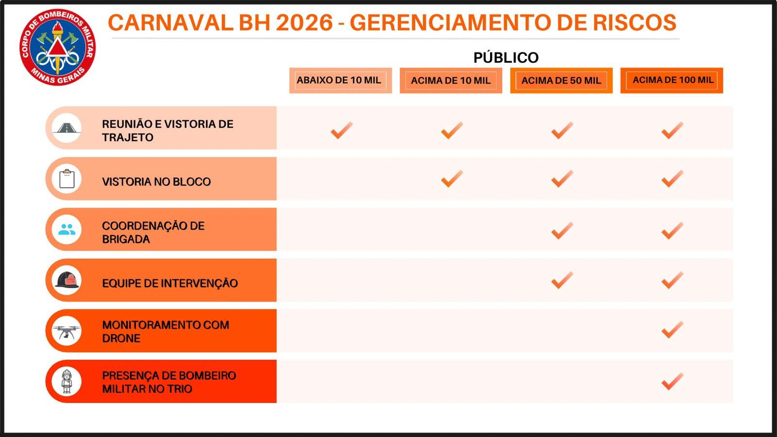 O crescimento do Carnaval de rua em Minas Gerais nos últimos anos levou o Corpo de Bombeiros Militar a evoluir sua forma de atuação, transformando experiências anteriores e dados operacionais em inteligência para 2026. Diante da complexidade de gerenciamento do risco em hiperpúblicos, foram estabelecidos eixos de atuação, que têm como parâmetro o lançamento de equipes e tecnologias de acordo com o quantitativo de público em cada desfile.