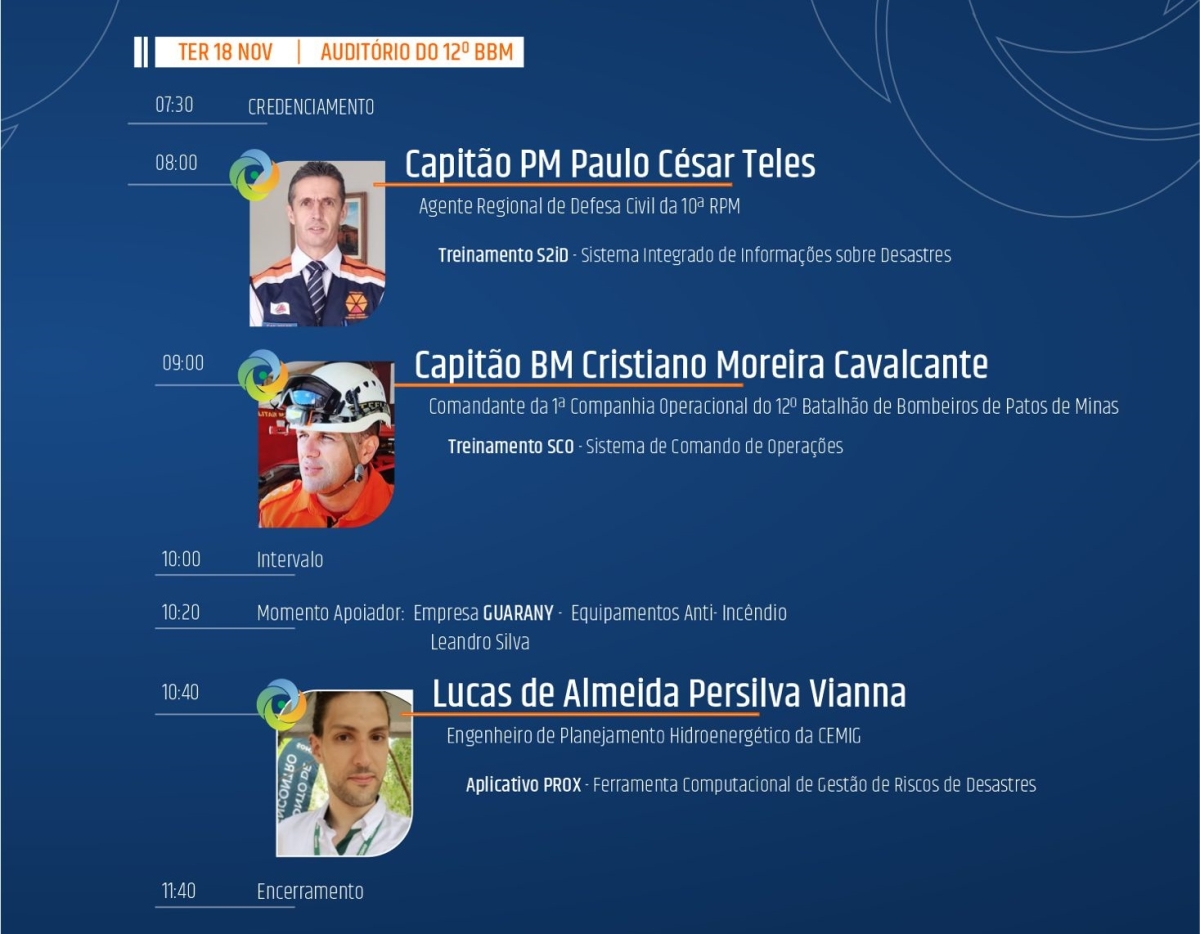 À tarde, o seminário traz painéis com Sidnei Furtado Fernandes, do Centro de Resiliência de Campinas (MCR2030/UNDRR); Adalberto Vieira de Souza, da Universidade Federal de Viçosa (UFV); e o major BM Arthur Fábio Ferreira, especialista em políticas públicas e subcomandante do 12º BBM, que discutirão as tendências climáticas, estratégias preventivas e de resposta a região do Alto Paranaíba e noroeste mineiro para o período chuvoso que se aproxima assim como uma reflexão sobre a importância da adesão aos municípios na Iniciativa da ONU MCR 2030.