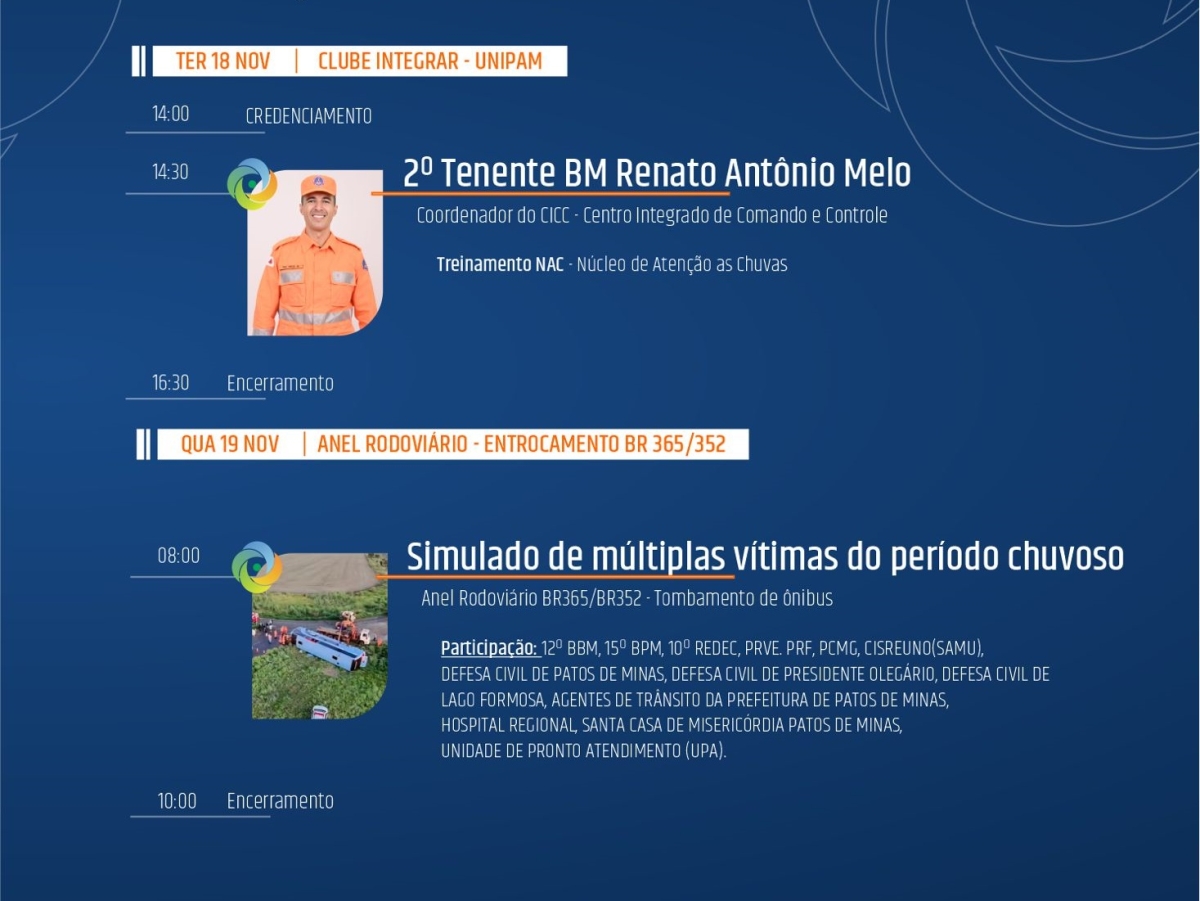 Grande Simulado de Múltiplas Vítimas, em preparação ao período chuvoso, na BR 365/352 Trevo da Pipoca (Viaduto de Patos de Minas), com um cenário de tombamento de ônibus. A ação integrará Corpo de Bombeiros, Polícia Militar, Polícia Civil, Polícia Rodoviária Federal, SAMU (CISREUNO), Prefeitura Municipal, SETTRAN, Hospital Regional, Fundação Santa Casa, UPA e demais parceiros, em uma operação de resposta coordenada.