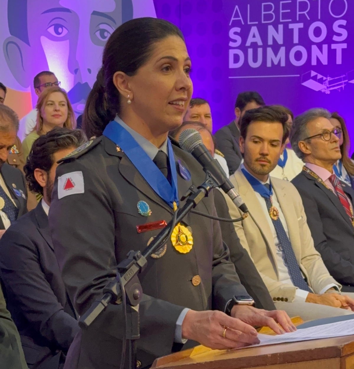 “É uma honra assumir esta tribuna nesta terra que guarda a memória do genial mineiro Alberto Santos Dumont. Seus feitos não se restringem a aviação. É, sobretudo, um convite permanente à inovação, à coragem, à superação e ao compromisso com o bem comum. ”, ressaltou a comandante-geral.